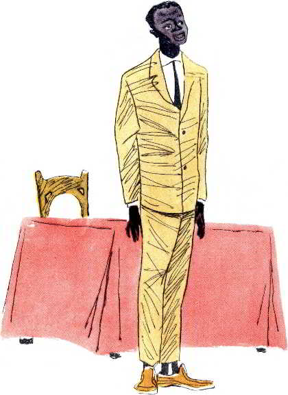 Он снял пальто в раздевалке и с огорчением увидел, что всё пальто в белых пятнах. Шляпа тоже была испорчена. Большой перепончатый зонт не спас от снега. Липкий и яркий, как свежая краска, снег налип на пальто и на шляпу. Негр виновато протянул свою одежду старушке в синем халате. Он хотел предупредить, чтобы старушка не испачкалась, но не знал, как это сделать.