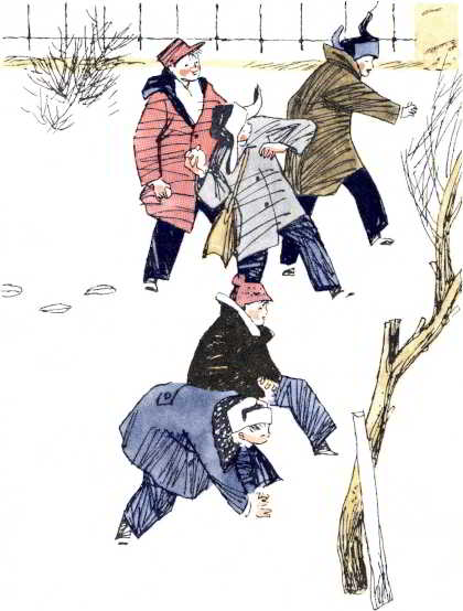 Не сговариваясь, новые друзья негра Мамаду стали подхватывать пригоршни снега, делать из него белые мячики и кидать друг в друга. К его удивлению, ребята не боялись снега и весело смеялись, когда снежный мячик попадал в них. Некоторое время негр с любопытством следил за игрой. Он думал о том, как хорошо было бы привезти мешок белых снежков своему сыну и его друзьям. В жаркий день очень приятно поиграть в снежки. Потом он осторожно нагнулся и большой чёрной рукой поддел горсточку снега. Снег не жёгся, а холодил руку. Мамаду ловко бросил снежок и посмотрел на ладошку: нет ли ожога. Он оторвал взгляд от руки и увидел девочку. Она улыбнулась и показала Мамаду два зуба, растущих в разные стороны. Это была его знакомая. Жителю Мали хотелось многое сказать, но пока он обдумывал, как это сделать, девочка убежала, смешалась со всеми ребятами, и Мамаду снова не смог отличить её от других белых девочек.