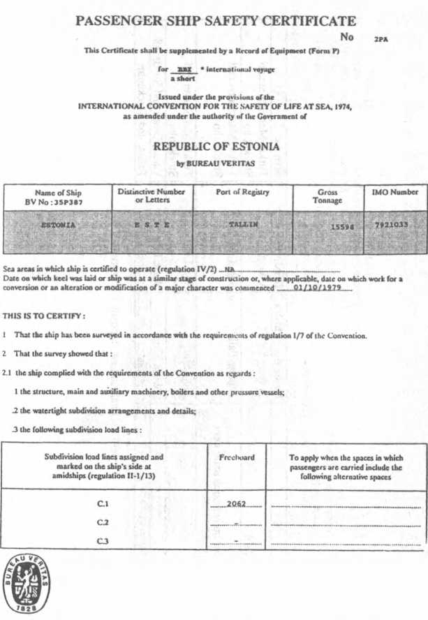Но после передачи судна Эстонии и его переименования проверку норм безопасности и средств спасения по поручению эстонской службы безопасности мореплавания (Estonian Maritime Board) приняло на себя бюро Veritas[5]5