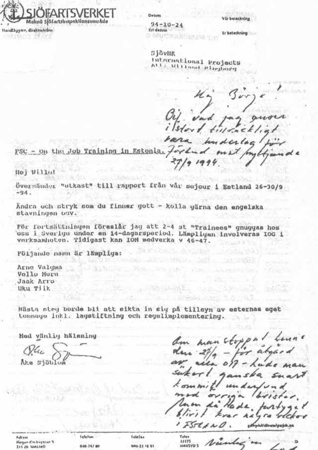 В более позднем сопроводительном письме, адресованном руководителю шведской группы в аварийной комиссии Бёрье Стенстрёму, содержатся и интересные рукописные добавления: «Бёрье, обрати внимание на прилагаемый документ, который, как я полагаю, должен был воспрепятствовать выходу «Эстонии» в море 27.09.1994 года». И далее внизу: «Если она («Эстония». – Авт.) была бы остановлена, чтобы все 017 (в соответствии с кодом это означает все недостатки и дефекты, обнаруженные при проведении инспектирования. – Авт.) были устранены, то, наверное, оставшиеся неисправности могли бы быть быстро найдены, и для их устранения судно должно было бы задержаться в Эстонии на несколько недель. С наилучшими пожеланиями, L.-O. Э.».