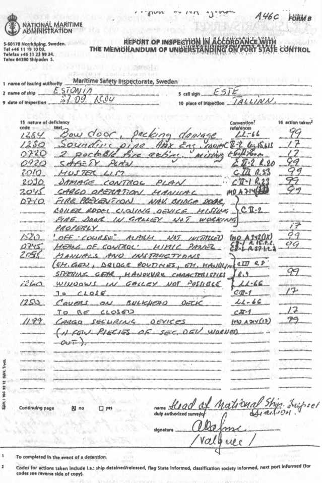 Автором этого примечания является тогдашний главный инспектор бюро Veritas в Стокгольме Ларс-Олаф Эрлендер, который был хорошо осведомлен о техническом состоянии парома. В заключительном сообщении аварийной комиссии оригинал документа отсутствует, хотя комиссия и располагала им, о чем свидетельствует вписанный на его правом поле регистрационный номер 46С. А вместо этого документа в сообщение включен измененный вариант, производящий впечатление ничего не значащей бумажки.