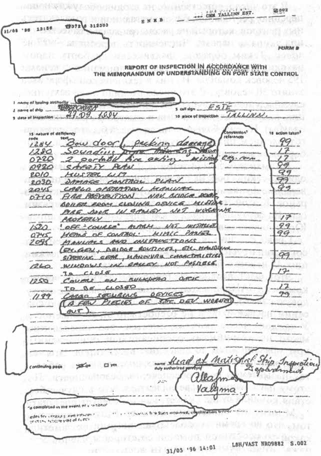 Совершенно очевидно, что оригинал заполненного и подписанного руководителем эстонской инспекции безопасности мореплавания Аарне Валгмой перечня дефектов и недостатков был передан члену аварийной комиссии JAIC Оке Сьюблому в установленном порядке, поскольку был зарегистрирован секретарем комиссии под номером 46С.