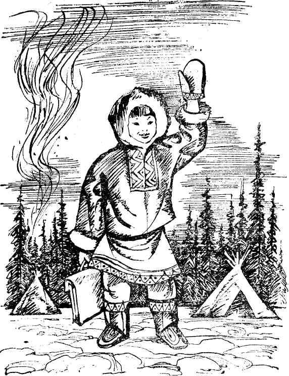 «На дворе стужа, ночью даже от мороза трещали деревья. Но в чуме было тепло. Мне казалось, что нет в жизни ничего дороже нашего жилья. Всю ночь тлел очаг посреди чума. Я лежал на мягких оленьих шкурах, а когда наступали сильные морозы, бабушка засовывала меня в меховой мешок… Раньше бабушка рассказывала много сказок про зверей. Больше всего в них говорилось о коварстве хитрой лисы…