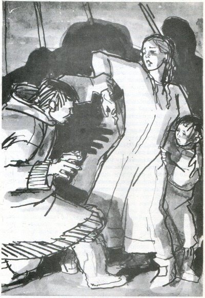 Совет, Красный Корень, Журавль и Учитель быстро запрягли несколько оленьих упряжек и помчались вдогон, по свежему следу. В тайге они наткнулись на разобранный чум. У потухающего костра в полузабытьи сидела женщина, прикрывая малицей крошечных детей. Казалось, она совсем замёрзла.