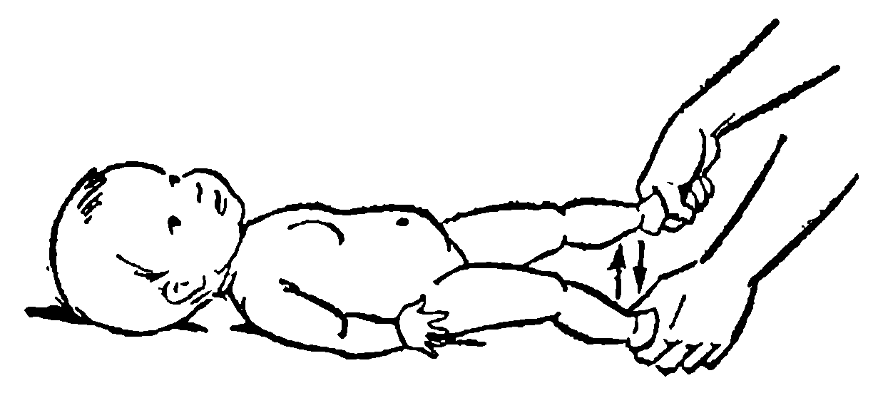 на первых трех занятиях попеременно сгибайте и выпрямляйте ноги ребенка в коленных суставах («велосипед»);