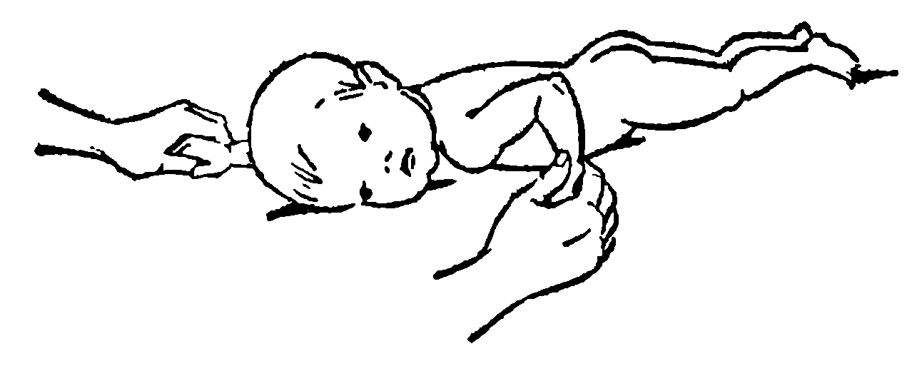Ребенок находится в положении на спине в «чепчике русалки» или поддерживается под затылок подвеской, находящейся в руках ассистента. Обхватите стопы ребенка, затем: