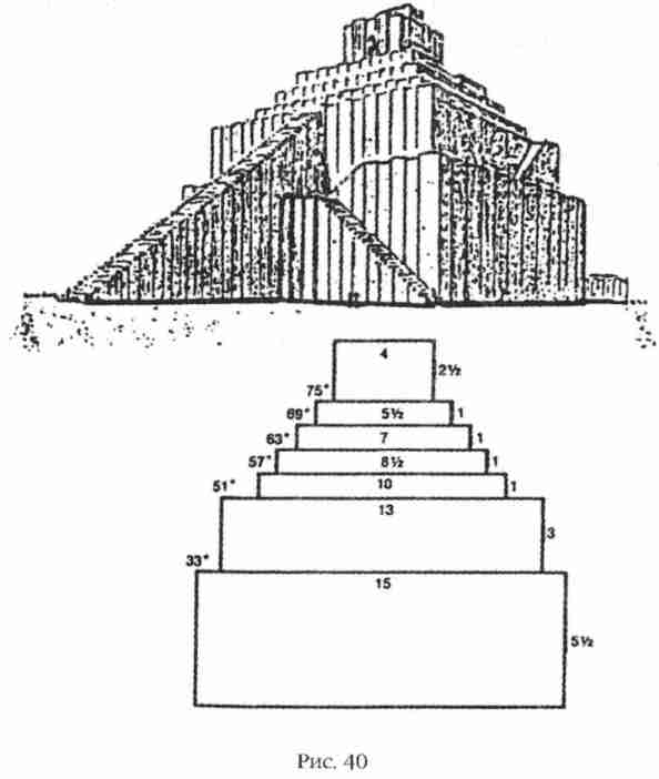 Поэтому он представлял себе будущий храм Эсагиль как астрономическую обсерваторию, которая сделает ненужными Энинну Нинурты и различные каменные круги, сооруженные Тотом. Когда Эсагиль был, наконец, построен, он представлял собой зиккурат, возведенный в соответствии с точным и подробным планом (рис. 40): его высота, расположение семи ступеней и ориентация были соотнесены таким образом, что вершина указывала на звезду Ику – главную звезду созвездия Овна – приблизительно в I960 г. до н. э.