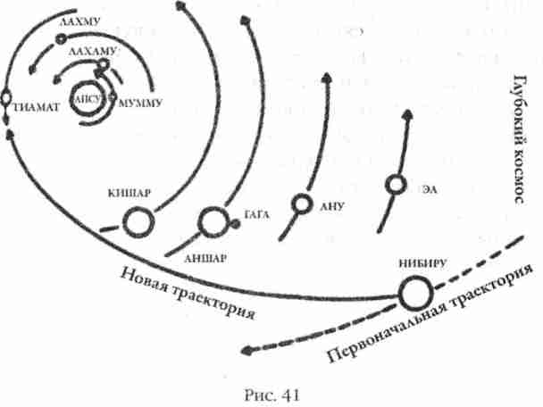 В соответствии с новой звездной религией был переписан миф о сотворении мира «Энума элиш», и в вавилонской версии Мардук получил звездное измерение: он не просто пришел с Нибиру – он был Нибиру. Новый вариант поэмы на «вавилонском» языке, представлявшем собой один из диалектов аккадского, прародителя семитских языков, отождествлял Мардука с Нибиру, родной планетой аннунаков и присваивал имя «Мардук» Великой Звезде/Планете, которая прилетала из глубокого космоса, чтобы возвестить о начале новой эры, небесной и земной (рис. 41). Это делало Мардука господином не только земли, но и неба. Его судьба – орбита в небе – превосходила судьбы остальных небесных богов (планет) (см. рис. 1), и это означало, что он является величайшим из всех богов аннунаков на Земле.