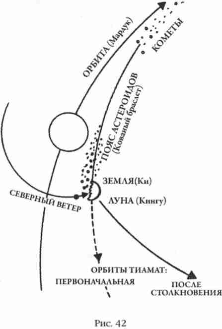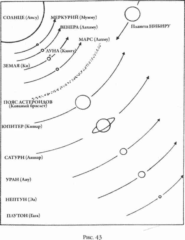 Исправленный миф о сотворении мира читался на четвертый день новогоднего праздника. В нем Мардуку приписывался подвиг победы над чудовищем Тиамат в Небесной Битве, а также сотворение Земли (рис. 42) и изменение Солнечной системы (рис. 43). В оригинальной шумерской версии все эти деяния приписывались планете Нибиру и были составной частью сложной научной космологии. Новая версия далее утверждала, что Мардук создал человека, изобрел календарь и выбрал Вавилон в качестве «пупа Земли».