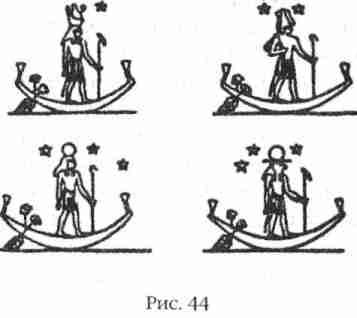 Праздничные церемонии делились на две части. Первая включала пересечение Мардуком реки в лодке, когда он направлялся к сооружению под названием Бит Акити («дом Акити»), а вторая проводилась в самом городе. Совершенно очевидно, что одиночное путешествие Мардука символизировало небесный путь планеты из открытого космоса в Солнечную систему – путешествие в лодке по воде в соответствии с представлениями о межпланетном пространстве как первозданной «водной бездне», которую пересекают «небесные лодки» (космические корабли). Отображение этой концепции наиболее ярко представлено в египетском искусстве, где небесные боги бороздят небо на «небесных барках» (рис. 44).