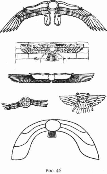 В соответствии с этой концепцией Мардук был невидим на земле, в частности в Египте, потому что его главная обитель находилась в другом месте. Один длинный гимн указывает на Вавилон как на место, где боги празднуют его победу (ученые, однако, полагают, что это не месопотамский Вавилон, а египетский город с тем же названием). Его не видно на небе, потому что «он далеко в небе» и «уходит за горизонт», в высшую точку небес. Египетский символ власти – Крылатый Диск в обрамлении двух змей – обычно интерпретируется как солнечный диск, «потому что Ра – это солнце», но в действительности это древнейший символ Нибиру (рис. 46), и именно планета Нибиру стала далекой невидимой звездой.