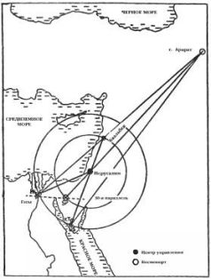 После Великого потопа аннунаки предоставили в распоряжение человечества три региона планеты, оставив за собой четвёртый – Синайский полуостров. Здесь, на центральной равнине, поверхность была плоской и твёрдой (по мнению современных военных, превосходный танкодром) – в отличие от покрытой илом и заболоченной после Потопа равнины Месопотамии. Вновь выбрав в качестве опорной точки двойную вершину Арарата, аннунаки ещё раз провели линию посадочного коридора под углом 45 градусов к географической параллели на 30-м градусе северной широты (рис. 70).