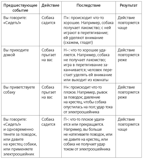 В таблице 3.1 приведены примеры подкрепления и наказания. Обратите внимание, что последствие должно влиять на поведение. Например, вы гладите собаку для положительного подкрепления, но на ее действия это не влияет. Значит, именно для этой собаки ласка не является подкреплением.
