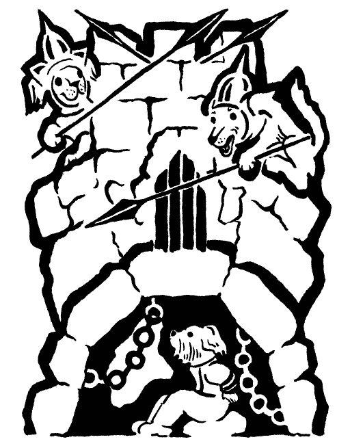 – Как я мог превратиться в пса? – размышлял Пётр, которого связали и опустили в голодную тюрьму в подземелье. (Вот видите, в замке Мяу действительно есть тюрьма!) До сих пор в ушах его звучало ненавистное мяуканье кошек, которые узнали, что среди них находится пёс. Некоторые кошки зашли так далеко, что требовали для Петра высшей меры наказания – утопления в молоке. Но поскольку им было жалко молока, победило предложение Мурека, чтобы собачий разведчик, за которого принимали Петра, был брошен в подземную тюрьму, где он погибнет голодной смертью.