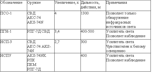 Таблица 11. Приборы ночного видения для пехотного вооружения