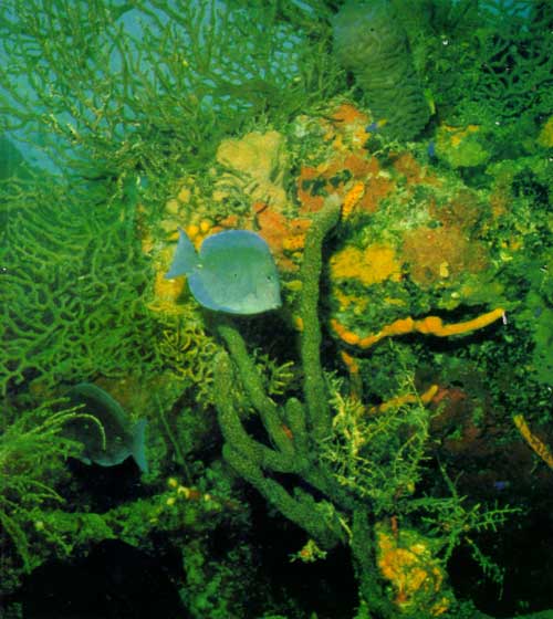 Экосистемы тропических рифов обладают сложной структурой. На дне раскинулись веерообразные горгонарии, инкрустированные водорослями, желтые и красные губки, к которым жмутся голубые рыбы-хирурги.