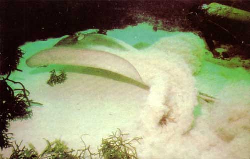 Скаты-хвостоколы, вооруженные опасными ядовитыми шипами, скрываются в песке, выставив наружу одни глаза. Потревоженные, они внезапно «взлетают», окатываясь поднятым песчаным облаком.