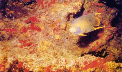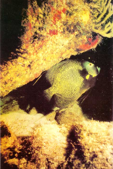 Рыба-ангел – королева Карибского моря; чешуя ее образует весело желтеющий сплав золота и лазури; по мере развития рыбы ее расцветка меняется. Это уже взрослая рыба на фоне скал, инкрустированных красными водорослями.