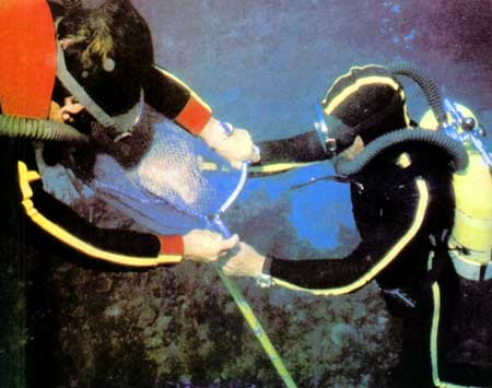 Самка с брюхом, из которого готова хлынуть икра, в свою очередь, предстала перед входом в грот. Мы усыпляем ее, набрасываем сетку, затягиваем шнур и мигом вытаскиваем на поверхность. Она присоединяется к самцу, которого мы столь ультимативно предназначили ей в пару».