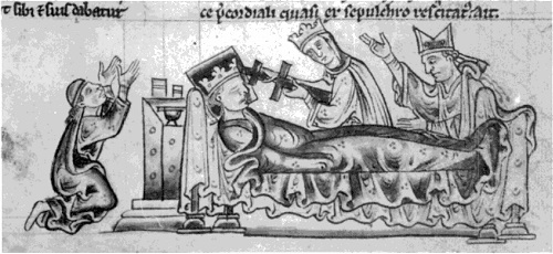 На этом рисунке английского хрониста Мэтью Пэриса, проявлявшего большой интерес к Людовику Святому, изображен король в ключевой момент своего царствования: во время тяжелой болезни, после которой король дал обет крестового похода. Рядом с королем, на выздоровление которого уже не надеялись, его мать, подносящая ему реликвию (крест), и епископ Парижский, указывающий душе короля путь на небо; душе при этом помогает коленопреклоненный человек. Кембридж, Колледж Тела Христова.