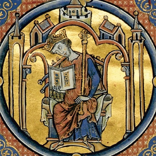 На этой миниатюре императорской Библии, хранящейся в Вене, мы видим Людовика Святого еще до канонизации (без нимба); он сидит на троне, читая иллюминированную Библию, с короной на голове и со скипетром в левой руке, увенчанным цветком лилии. Библия – сакральный предмет королевской роскоши. Суверен, словно священной оградой, окружен сооружениями дворцовой и церковной архитектуры. В обрамленном бородой лице образцового и обладающего влиянием государя проступают черты реального человека. Кающийся король – это и король-мудрец, читающий Священное Писание. Вена, Австрийская Национальная библиотека.