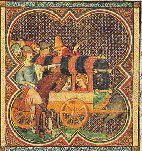 Людовик вместе с матерью едет в Реймс на коронацию. На этой миниатюре «Часослова Жанны» (7334), королевы Наваррской, дочери Людовика X Сварливого и, стало выть, праправнучки Людовика Святого (1317–1349), видна вся зыбкость положения юного короля и его матери; они сидят в простой повозке. Транспортные средства даже у королевских особ, если они не ехали верхом или не плыли на ладьях, были весьма скромны. Париж, Национальная библиотека.