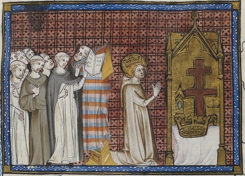Король в сопровождении клириков капеллы изображен в обычной позе поклонения – на коленях, молитвенно сложив руки перед Истинным Крестом и терновым венцом в Сент-Шапели; это жесты высочайшего благочестия, обращенные к самым ценным реликвиям, благодаря которым он, пребывая на земле, вступает в тесный контакт с самим Спасителем. Париж, Национальная библиотека.