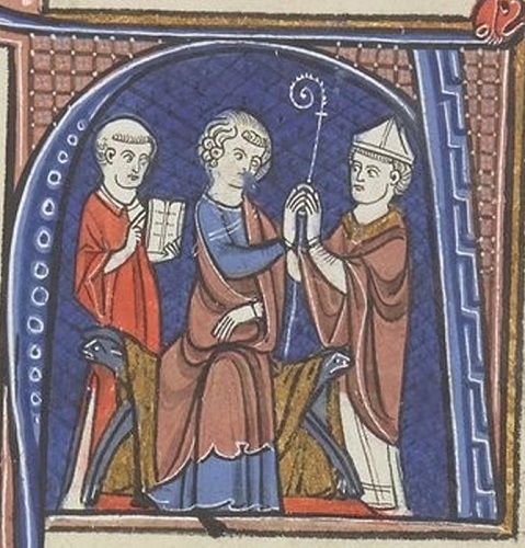 Создание этих миниатюр в Ordo 1250 г. относится ко времени правления Людовика Святого. На них изображены два главных момента коронации.