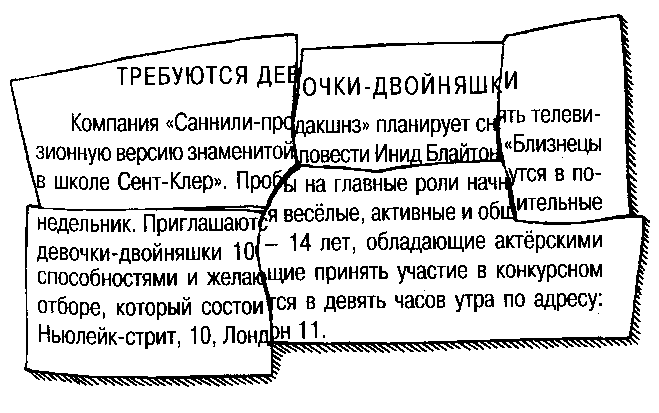 Компания «Саннили-продакшнз» планирует снять телевизионную версию знаменитой повести Инид Блайтон "Близнецы в школе Сент-Клер". Пробы на главные роли начнутся в понедельник. Приглашаются девочки-двойняшки 10–14 лет, обладающие актерскими способностями и желающие принять участие в конкурсном отборе, который состоится в девять часов утра по адресу: Ньюлейк-стрит, 10, Лондон 11.