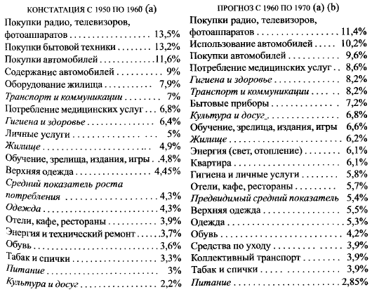 В правительственных проектах нет ничего революционного. Но французский план предусматривает по сравнению с тем, что происходило между 1950 и 1960 гг., выбор ускорения (медицинское потребление, досуг, расходы на издания, отопление и освещение и т. д.) и сдерживания (довольно относительного), так как если покупки автомобилей растут более чем на 9 % в год (вместо прежних 11,6 %), то производство и импорт более чем удвоятся за десятилетие (в 2,5 раза вместо 3 раз), что еще является значительным.