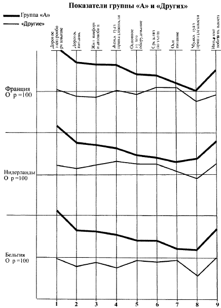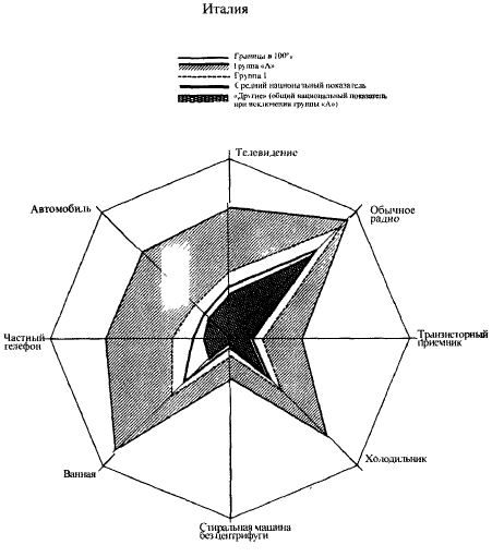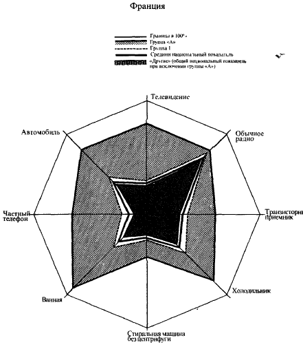 Диспропорция особенно заметна по статье «изысканное питание», то есть по существу в отношении современных продуктов питания. В Великобритании, Германии и Нидерландах «Другие» достигают едва двух третей обеспечения группы «А», тогда как во Франции, в Бельгии и Италии их показатели держатся на уровне ниже половины от показателей группы «А». Если средства по уходу за домом внутри каждой страны имеют почти такое же распределение, как обычные продукты питания, то жилищный комфорт и основное хозяйственное оборудование распределены более неравномерно. Особенно положение итальянских «Других» наиболее удалено от их группы «А». Что касается дорогого оборудования, то ни одна группа «Других» не достигает половины имущества соответствующей группы «А», что само собой разумеется, так как речь идет или о дополнительных предметах Дорогого оборудования (миксер, тостер, полотер и т. д.), или о дорогих предметах досуга (магнитофон, камера, цветная фотография).