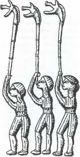 цирования используются духовые инструменты. Самым типичным из них является большая медная вертикальная труба, раструб которой чаще всего делается в форме головы вепря. Благодаря такой трубе звук разносится над головами воинов. Греки этот инструмент называют сатух, что определенно является его галатским названием. Есть и труба другого вида – более привычного; она сделана в виде рога. Неизвестно, используется ли барабан или другие ударные. Зато у галлов, так же как у германцев, есть привычка греметь доспехами. В бою к мощным и хриплым звукам труб галлы добавляют свои боевые кличи. У врага это вызывает ужас и преувеличенное представление о численности галльского войска. Если одержана победа, то воины возвращаются, распевая песню, которую Посидоний Апамейский называет ре ап. Непонятно, идет ли речь просто о победной песне, или же она имеет форму (с припевом, в котором есть слово «рёап») и назначение те же, что греческое пение – воздать хвалу богу Аполлону, которому кельты тоже поклоняются.