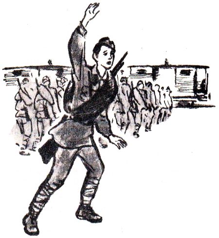 От служебного вагона уже бежала воспитательница. Из шеренги бойцов выскочил молоденький красноармеец. Он держался обеими руками за скатку, вытягивая вперёд тонкую шею.