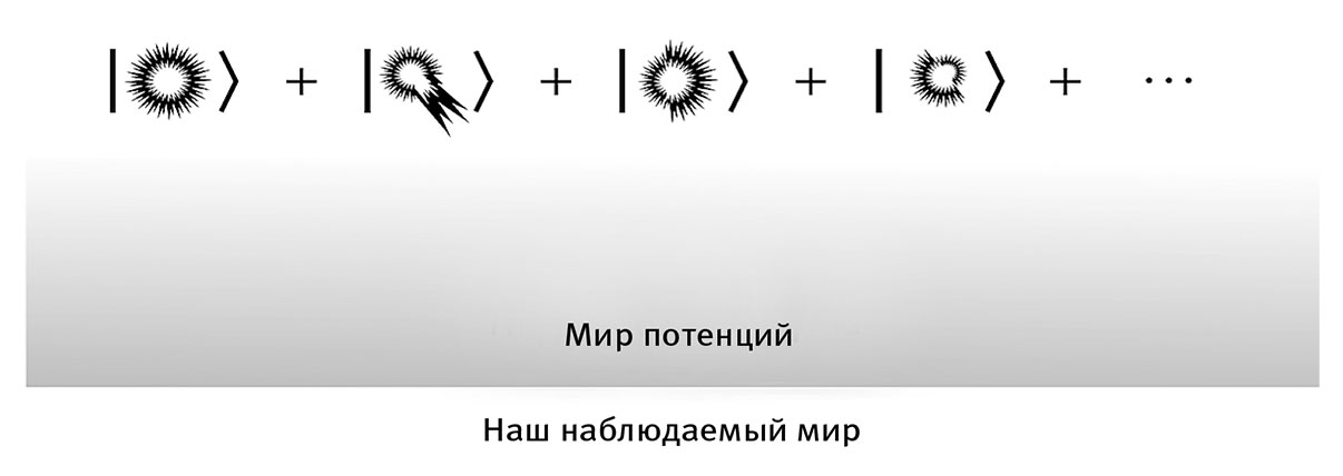 Давайте возьмем эти разные варианты Большого взрыва в кет-скобки и сложим при помощи знаков плюс, чтобы показать, что все они существовали бок о бок в одно и то же время, – как мы делали для случая с зомбокотом:
