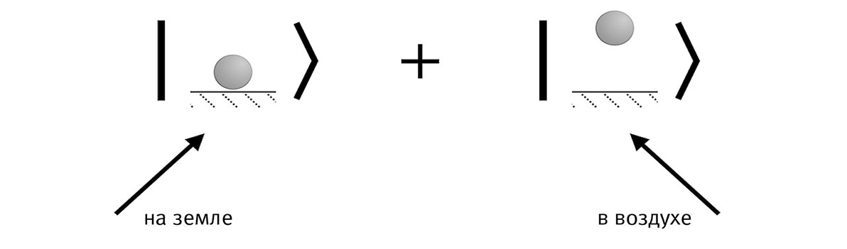 Пусть наша частица находится одновременно «на земле» и «в воздухе». Вот как это выглядит, если использовать кет-скобки: