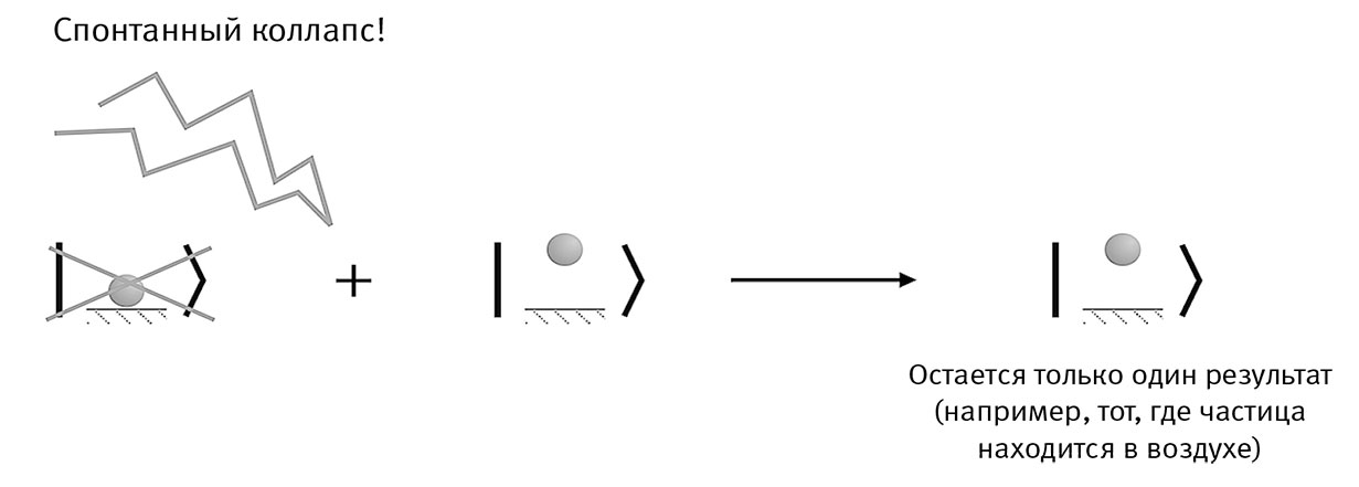 Нет никакого способа предсказать, когда произойдет такой спонтанный коллапс, и нет никакого способа предсказать, к какому результату это приведет. Единственное, что мы знаем наверняка, – что коллапс произойдет и реализуется одна из возможностей. Вот, собственно, и все!