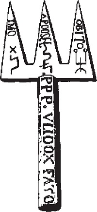 На трезубец также нужно нанести буквы и символы. Совсем не обязательно, чтобы высеченные линии выглядели красиво. Вполне достаточно многократными надавливающими движениями кончика ножа или зубила пройтись по нарисованным линиям до появления характерных следов на металле.