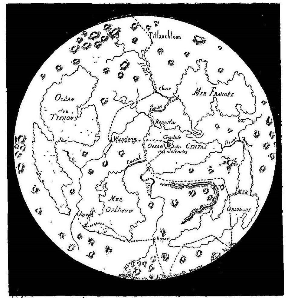 Однажды, перелистывая тома библиотеки, предоставленной в его распоряжение, то есть заставляя говорить ящик фонограф, профессор случайно встретил описание Луны. Вместе с тем он получил на экране подробную карту невидимого с Земли лунного полушария. Это последнее полушарие, подобно видимому, было всё испещрено большими серыми пятнами «морей» и «океанов». Были ли то действительно пространства покрытые водой, или только высохшие долины? – вот вопрос, который всецело занял старого учёного. Кроме морей, на карте были нанесены многочисленные кратеры и цепи высоких гор, а в некоторых местах стояли какие то точки. Телинга объяснил профессору, что это города.