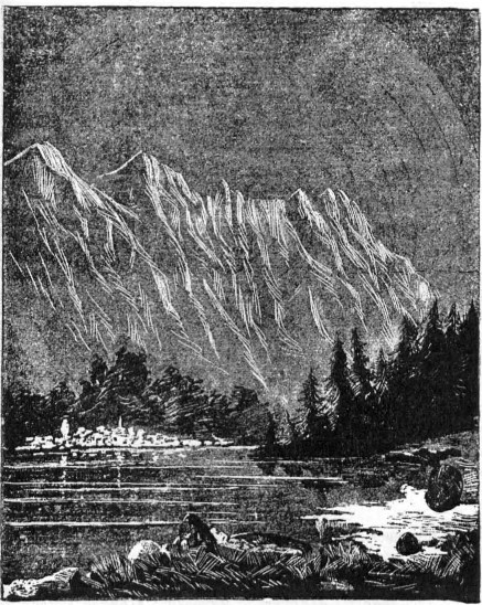 Через несколько минут путешественники увидели свет солнца. Повозка выкатилась на дно огромного кратера, который, по вычислениям Сломки, имел до десяти километров в диаметре и представлял из себя, по-видимому, главный кратер вулкана. Эта громадная арена окаймлялась высочайшими горами, причудливо зазубренные вершины которых и остроконечные пики поднимались вверх на неизмеримую высоту.