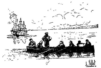 Через несколько минут шлюпка с четырьмя гребцами уже качалась на волнах. Инженер и Михаил Васильевич молча спустились по верёвочной лестнице. Гребцы дружно ударили веслами, и шлюпка, как стрела, полетела по направлению к видневшейся полосе земли.