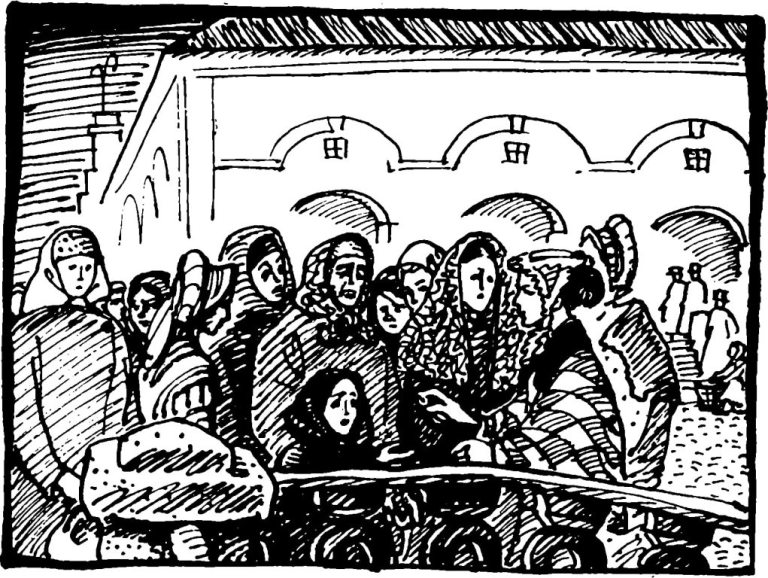 В углу, возле канала толпятся женщины в лаптях, в зипунах, с узелками в руках. Их много, наверное, больше ста. Некоторые между собой разговаривают, другие стоят молча.