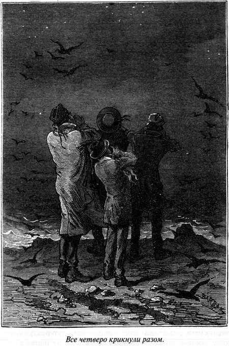 Время близилось к шести часам вечера. Туман сгустился, и стало совсем темно. Аэронавты, потерпевшие крушение, шли в направлении к северу по восточному берегу земли, на которую их выбросило волей случая, земли, совершенно им неизвестной, о географическом положении которой они не могли строить никаких догадок. Они шли, чувствуя под ногами то песок, то камни, – казалось, что земля тут совсем лишена растительности. Продвигаться вперед было очень трудно. Они шагали в темноте по каким-то буграм, местами попадались глубокие рытвины. Из них поминутно поднимались невидимые во мраке большие птицы и, грузно взмахивая крыльями, разлетались во все стороны. Другие птицы, поменьше, попроворнее, выпархивали целыми стаями и живым облаком проносились над головами путников. Моряку казалось, что это были бакланы и чайки, – он узнавал их по жалобным пронзительным крикам, перекрывавшим грозный рев прибоя.