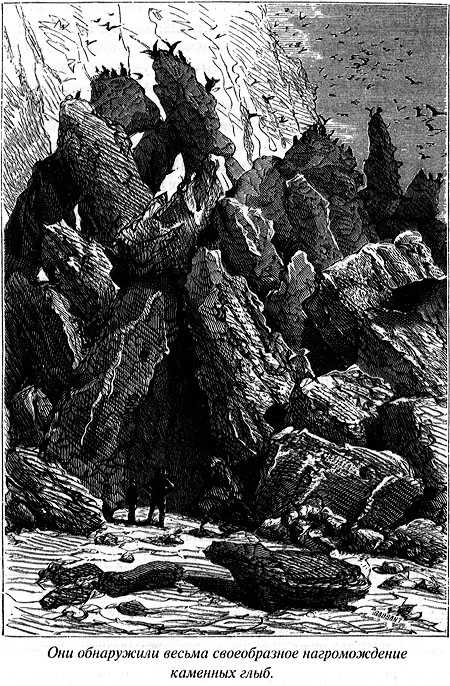 Однако недалеко от устья реки, выше того места, куда доходил прилив, они обнаружили очень своеобразное нагромождение каменных глыб. Такие природные сооружения нередко встречаются на гранитных возвышенностях и носят название «каминов».