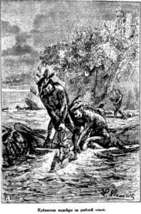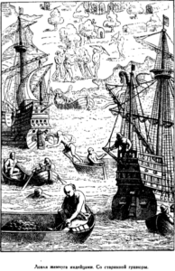 Возле одного острова испанцы наблюдали любопытное зрелище – необыкновенный способ рыбной ловли, который и до сих пор практикуется индейцами Антильских островов. «Рыбную ловлю индейцы называют охотой, потому что охотятся они с помощью одних рыб за другими, а гончих рыб спускают в воду, привязывая к их хвостам бечевки. Рыбы же эти величиной с угря, и пасть у них очень широкая с множеством присосков, как у каракатиц; они очень дерзкие, как наши хорьки. Когда их бросают в воду, они сразу же присасываются к любой рыбе, а затем уже не отпускают ее, и можно оторвать этих рыб от своей жертвы, только вытащив их из воды, а, будучи в воде, они выпускают добычу только мертвые. Рыба эта очень легкая, и ее, как только она присосется, тянут за бечевку, привязанную к ее хвосту, и вытаскивают на поверхность, отбирая здесь добычу».