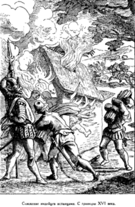 «За это время, – пишет Лас Касас, – произошли чудовищные избиения индейцев, и целые области совершенно обезлюдели, особенно в королевстве Каонабо… Так произошло потому, что индейцы прилагали все свои силы, чтобы попытаться выбросить из своей страны таких жестоких и свирепых людей. Они видели, что без малейшего на то повода, без всякого вызова с их стороны их лишают родины, земли, свободы, жен и детей и самой жизни и ежедневно истребляют жестоко и бесчеловечно. При этом христиане легко достигали своей цели, ибо бросались на индейцев на лошадях, разили их копьями, рубили мечами, рассекая людей надвое, травили их собаками, которые терзали и пожирали индейцев, сжигали их живьем и подвергали на разный манер иным немилосердным и безбожным пыткам… Таким образом, как о том пишет сам адмирал королям, усмирено было население острова, по его словам, неисчислимое, и силой и хитростью от имени их величеств приведены были к покорности все народы. Адмирал же, как испанский вице-король, обязал каждого касика или туземного короля платить за землю, которой они владели, подать