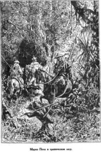 Желание увидеть новые страны было настолько сильно у Марко Поло, что он уклонился на пятьсот миль в сторону, к берегам Аравии; он остановился здесь близ островов Мужского и Женского, названных так потому, что на первом острове жили одни мужчины, а на втором женщины, и только в марте, апреле и мае мужчины имели право посещать Женский остров. От этих островов флотилия Поло направилась к острову Скотра (Сокотра), лежащему у входа в Аденский залив. О жителях этого острова Марко Поло отзывается, как об искусных колдунах, способных силою своих чар повелевать бурями и ураганами. Спустившись затем на тысячу миль к югу, он направил свой флот к берегам Мадагаскара.[49]49