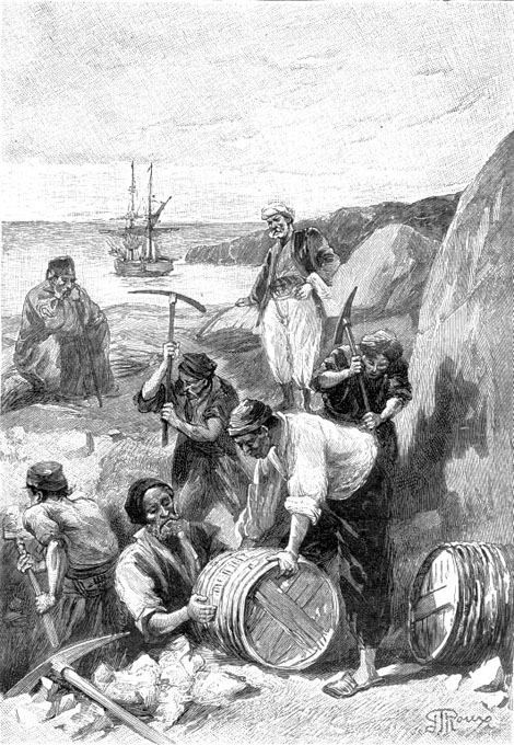 По приказу капитана Зо матросы выгрузили бочонки и инструменты и начали выдалбливать яму.