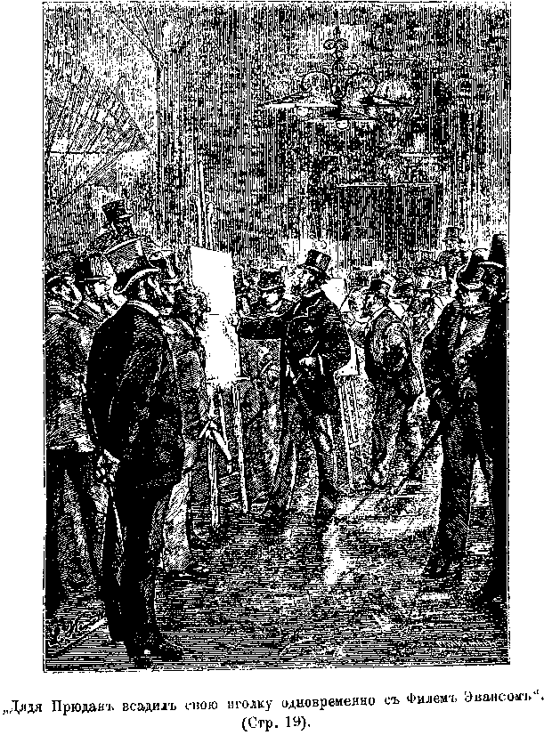 Хотите знать, какъ случилось, что Филь Эвансъ не попалъ въ президенты клуба? Голоса совершенно поровну раздѣлились между Эвансомъ и Прюданомъ. Двадцать разъ дѣлали перебаллотировку и всякій разъ ни тотъ, ни другой не могли получить большинства.