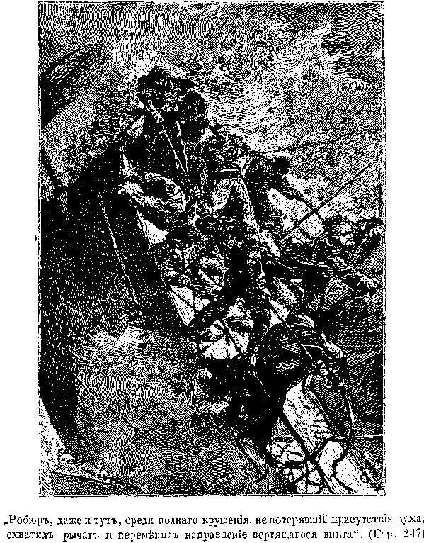 Тогда Робюръ, даже и тутъ, среди полнаго крушенія, не потерявшій присутствія духа, пробрался въ полуразрушенную рубку, схватилъ рычагъ и перемѣнилъ направленіе вертящагося винта, сдѣлавъ его изъ поступательнаго подъемнымъ.