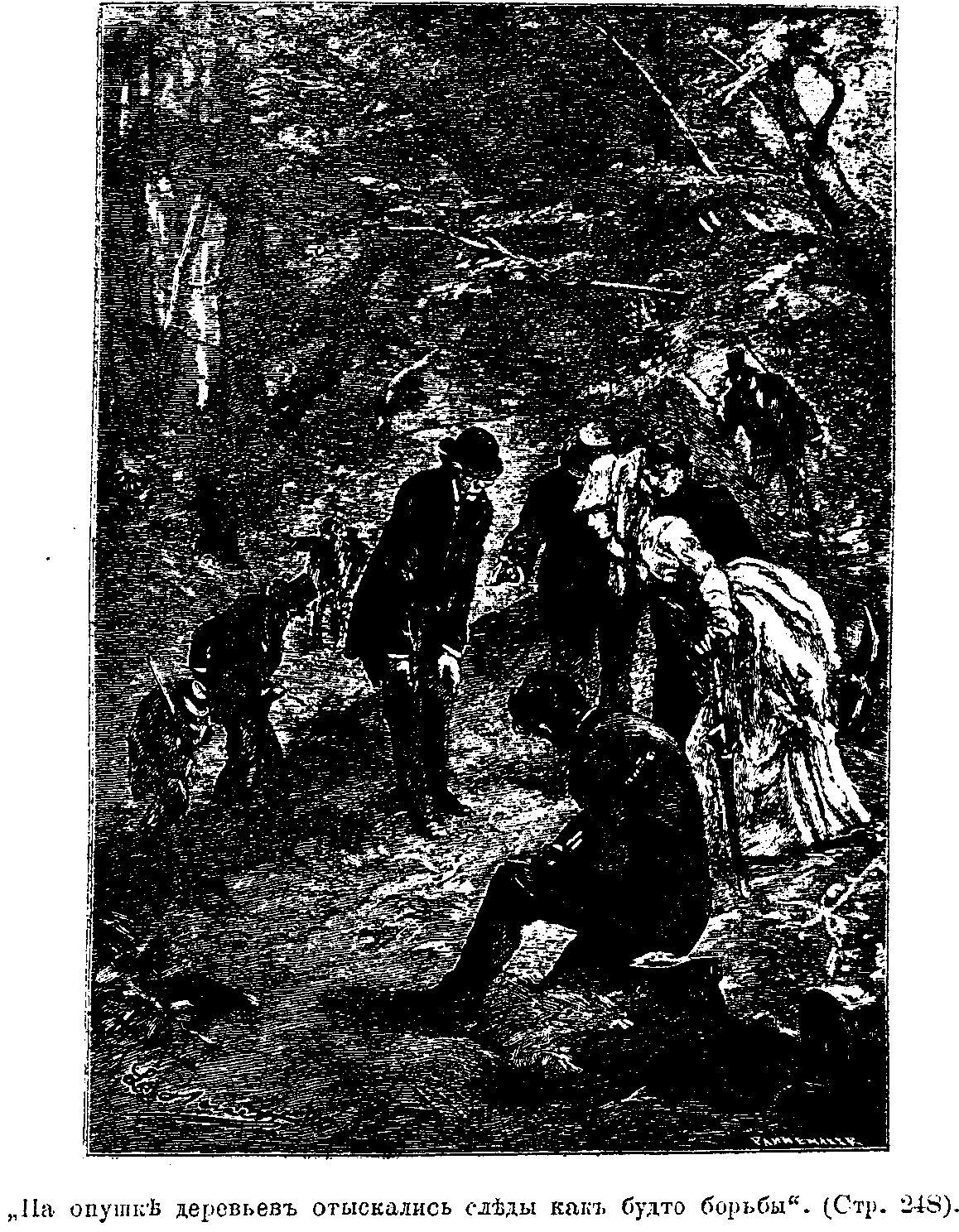 Впрочемъ, при осмотрѣ лужайки въ паркѣ оказалось, что трава на ней какъ-то подозрительно измята. На опушкѣ деревьевъ отыскались слѣды какъ будто борьбы.